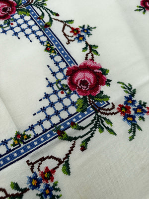 textiles from the past, including embroidered tablecloths, tapestries, antique